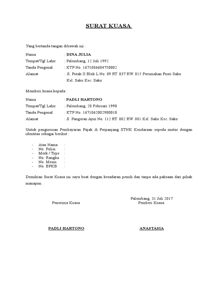 Selengkapnya akan dibahas di bawah ini. Itulah contoh surat kuasa yang bisa digunakan. Contoh surat kuasa dalam artikel ini meliputi contoh surat kuasa perseorangan, kedinasan, kuasa bank contoh surat kuasa untuk dijadikan referensi. Semoga saja dapat berguna dan membantu anda. Persiapkan dulu syarat bayar pajak motor secara lengkap, ya. Demikian penjelasan tentang pajak kendaraan bermotor milik perusahaan. Persiapkan surat kuasa yang sudah bermaterai dan memiliki stempel sah dari perusahaan. Pajak kendaraan motor dan mobil harus dibayar tepat waktu sesuai dengan tanggal jatuh tempo pajak kendaraan anda berakhir. Contoh surat kuasa untuk mengurus samsat atau pajak mobil dan motor samsat kendaraan atau pajak dari kendaraan harus dibayar tepat waktu lhoo contoh surat keterangan pengalaman kerja. Jika anda ingin mengurus pembayaran dan. Apabila pengesahan stnk diwakilkan orang lain, maka harus membawa surat kuasa. Contoh surat kuasa yang benar dan turorial lengkap cara membuatnya. Contoh surat kuasa terbaru 2019.