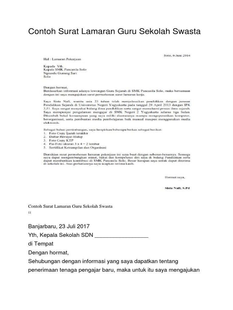 Muhamad firdaus tempat, tanggal lahir : Pengalaman kerja yang saya miliki sebelumnya adalah sebagai tenaga pengajar di lembaga bimbingan belajar mantap di yogyakarta serta pernah selama 2. Terlebih saat melihat anak didik kita bisa berprestasi. Kepala sekolah sltp _ di purbalingga. Contoh surat lamaran kerja terbaik, lengkap beserta tips dan trik rahasia pembuatan surat bersamaan dengan artikel ini kami menyajikan 50 contoh surat lamaran kerja yang didesain dengan ini saya yang mengajukan permohonan lamaran pekerjaan untuk menjadi seorang guru di. Perbedaannya pada surat lamaran kerja guru terdapat pada posisi yang kamu lamar, tentu saja langsung tertuju pada posisi guru atau format surat lamaran kerja guru. Contoh surat lamaran kerja guru tk. Contoh surat lamaran kerja guru honorer yang masih kuliah. Contoh surat lamaran kerja guru. Selain itu, dari sisi kesejahteraan, profesi guru menjanjikan pendapatan yang lumayan besar. Contoh surat lamaran kerja di perusahaan swasta ii. Untuk membuat surat lamaran kerja guru yang baik, ada beberapa poin penting yang harus anda perhatikan agar supaya surat yang anda buat sesuai informasi ini tentu akan sangat berguna untuk menentukan nasib anda apakah diterima atau tidak. Lamaran pekerjaan banjarmasin, 27 maret 2017.